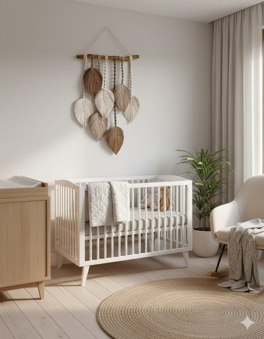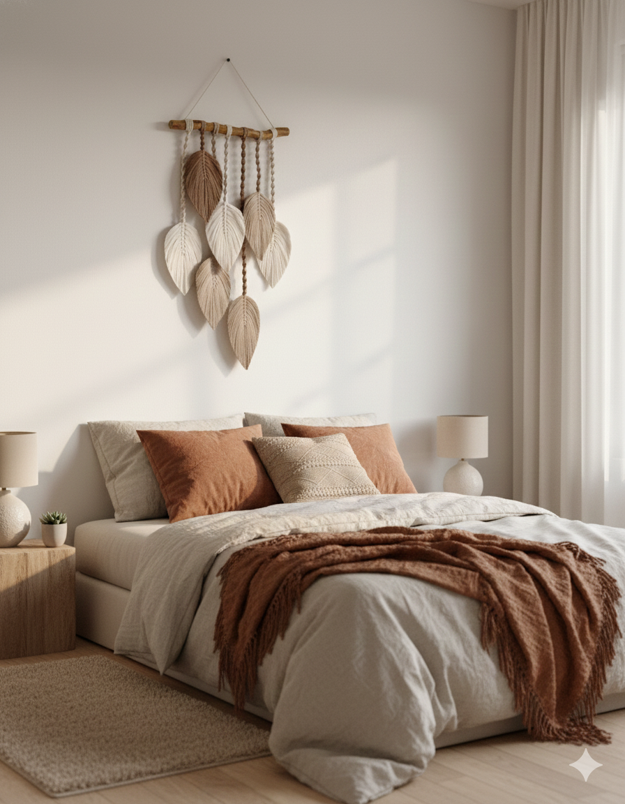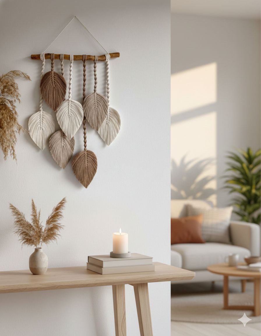 اكتشفوا جمال فن المكرمية بتصميم أوراق الشجر الأنيق. قطعة فنية مصنوعة يدوياً بكل شغف وإتقان، باستخدام خيوط قطنية بألوان ترابية هادئة (البيج، الأبيض الكريمي، والبني).