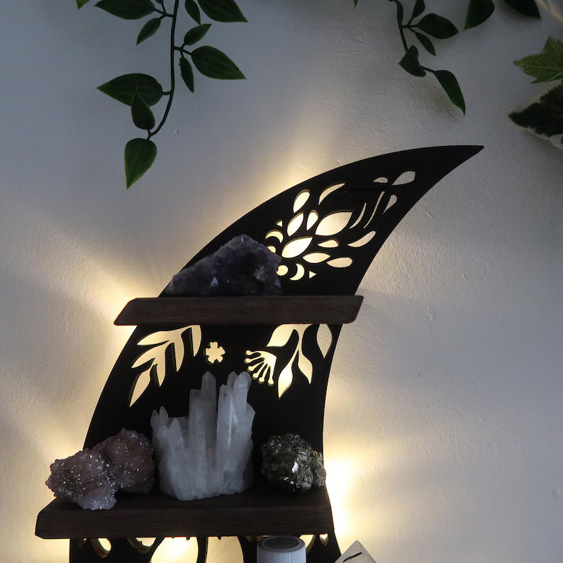 نقدم لك رف القمر الهلالي الفريد، المُصمم خصيصًا ليصبح نقطة جذب ساحرة في غرفة التأمل، غرفة المعيشة، أو غرفة النوم. يجمع هذا الرف بين الخشب الداكن المنحوت والإضاءة الدافئة لخلق جو صوفي لا يُنسى. ✨